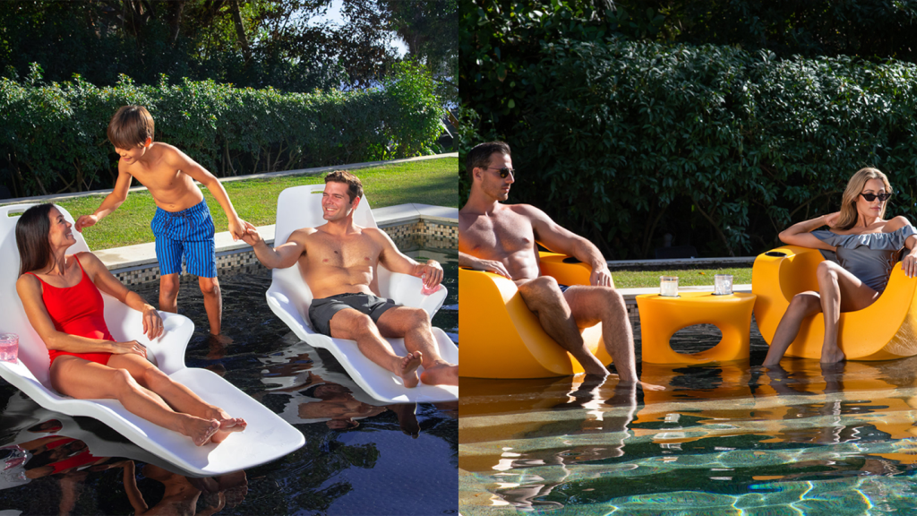 Their in-pool furniture features a threaded plug system where a plug is removed, and the furniture is filled with pool water to submerge itself and stay in place. The product lineup allows use in water depths from 9″ – 20″ depending on the chair or lounger selected. Risers are also available.